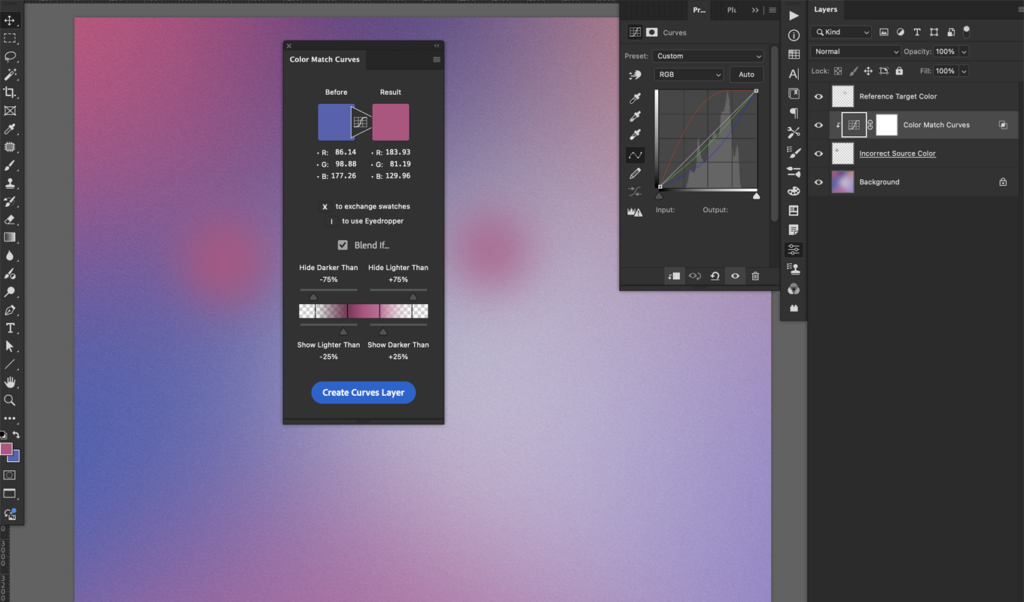 Color Match Curves works best for color MATCHING to a similar color, particularly a midtone, rather than color CHANGING to a drastically different color. Currently only RGB mode is supported.