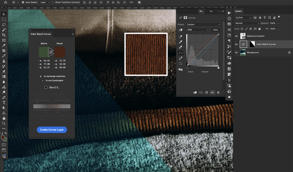 Color Match Curves is a plugin I created that allows the quick creation of Curves adjustment layers that match (almost) any color to any other color. This is similar to the gray point selector in the Curves properties, but it works for any color instead of just gray.